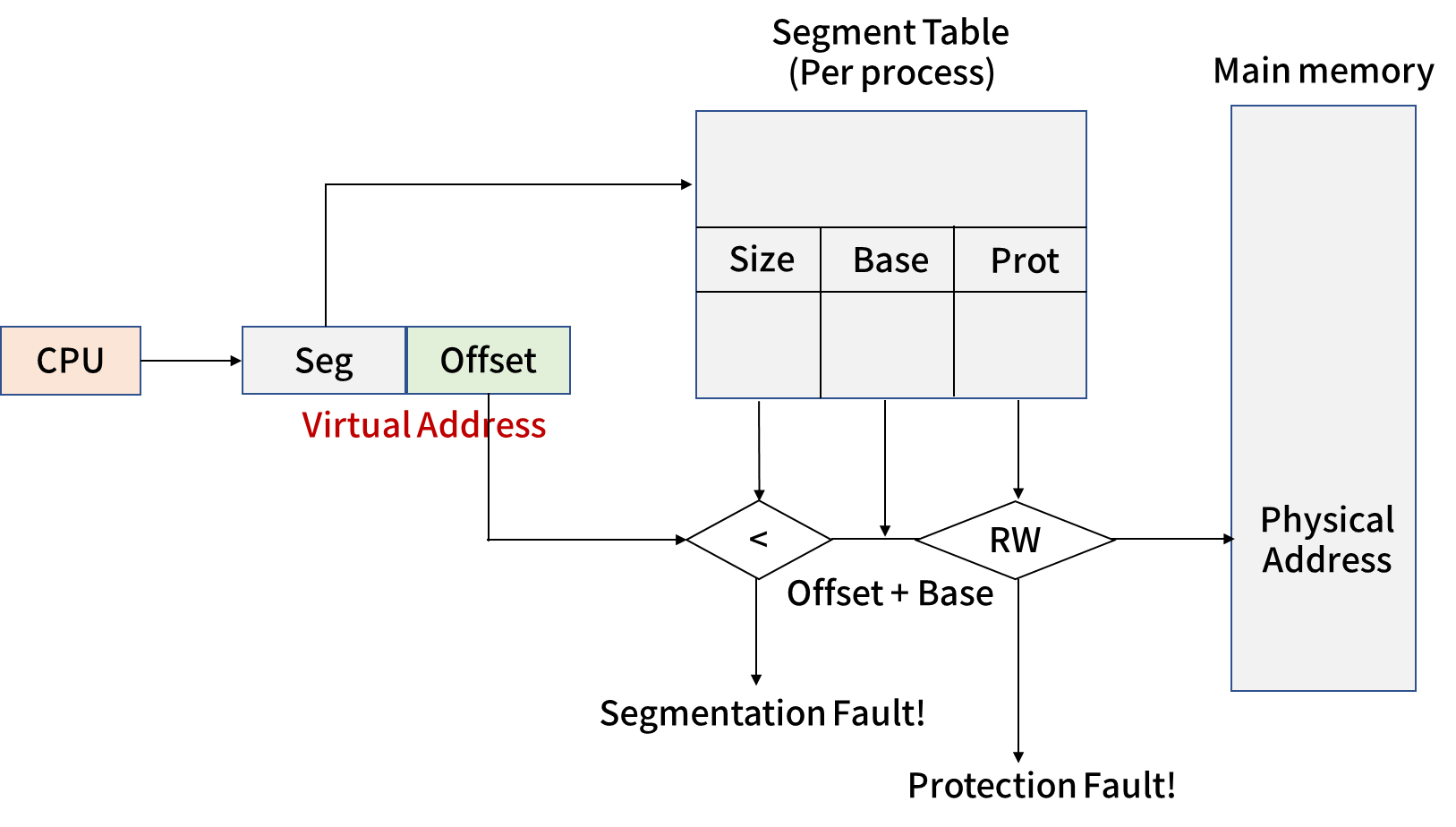 앞의 Segment bit로 Segment Table을 찾고 그것의 Size 와 Base를 알아낸 뒤 만약 Offset이 Size보다 크다면 Segment Falut를 출력하고 아니라면 Base+Segment를 Physical Address로 하여 Main memory에 접근합니다.